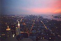 Wir stürzen aus dem Fahrstuhl und sehen gerade noch die letzten Strahlen der rotglühenden Sonne. New York liegt uns nun zu Füßen. Auch die von unten so riesig erscheinenden Wolkenkratzer Midtowns oder Lower Manhattans erhalten von hier oben eine ganz andere Perspektive. Während sich der Himmel blutrot färbt, gehen unten überall die Lichter an und unendlich lange Lichterketten ziehen durch die Straßen und Avenues. Die Nacht legt sich über Big Apple. Und auf der Plattform - ringsum liegen sich die Pärchen in den Armen und genießen den Zauber dieses Abends, Valentinstag 2004. ...zurück